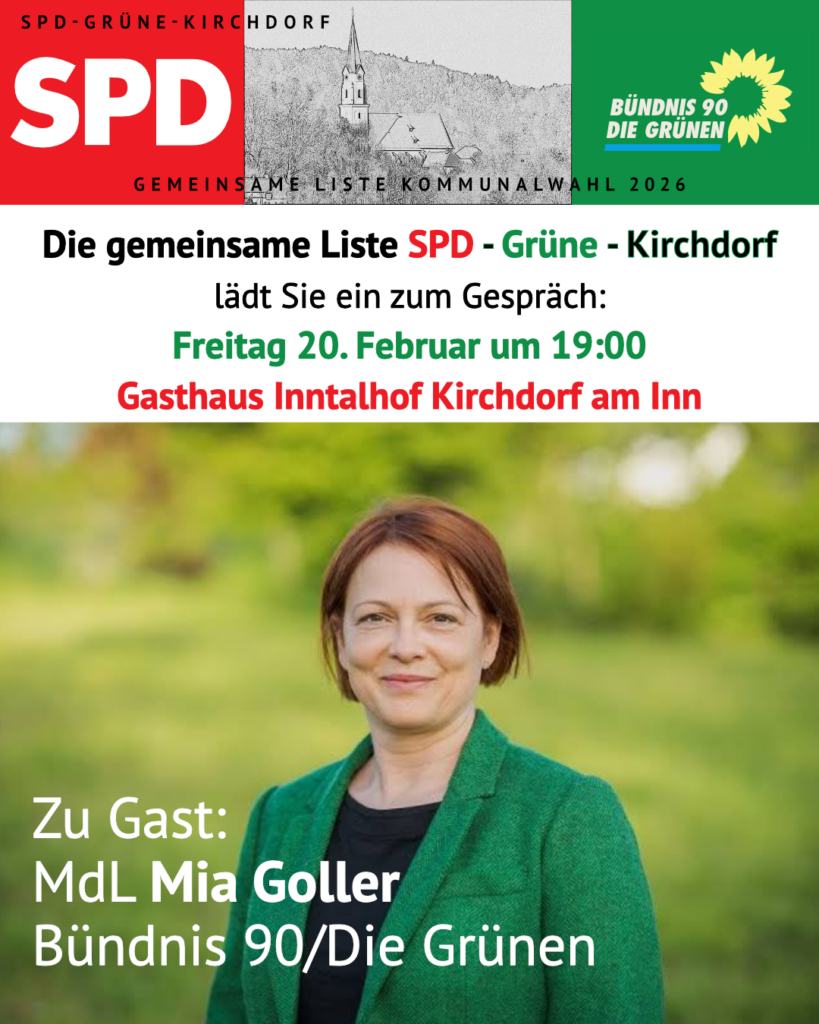 Wir freuen uns auf unserer Wahlveranstaltung die Landtagsabgeordnete Mia Goller begrüßen zu dürfen. Neben ihr werden weitere Amts- und Mandatsträger der Kreis-SPD und Kreis-Grünen zu Gast sein.